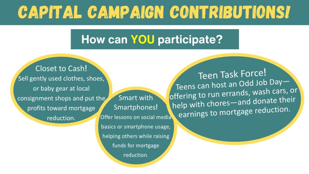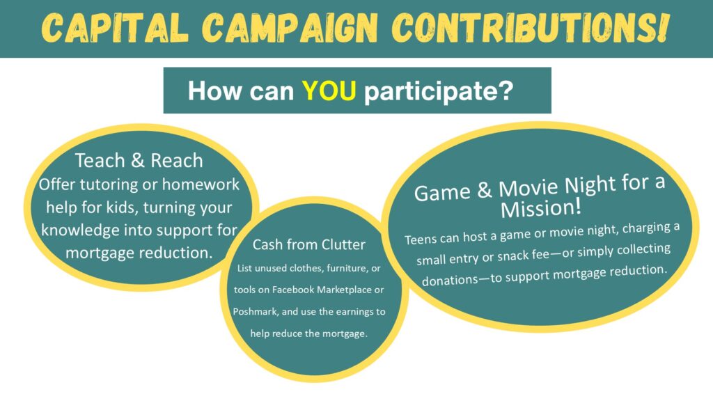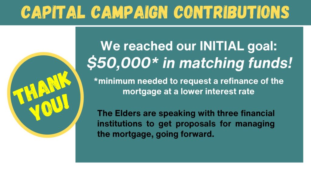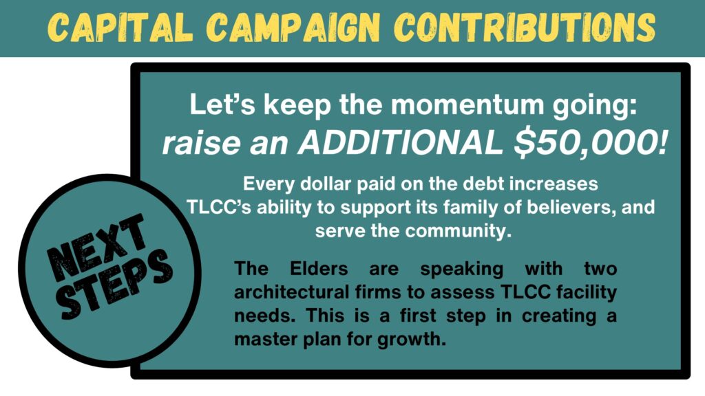 TLC has reactivated the Capital Campaign Team to lead our ongoing efforts in reducing the church mortgage. This team was originally formed after the payoff of our current land and the start of our building journey. As we continue working toward financial freedom, the Capital Campaign Team will help guide and communicate each step of the process. Please check here regularly for updates, progress reports, and important information regarding the mortgage reduction campaign.